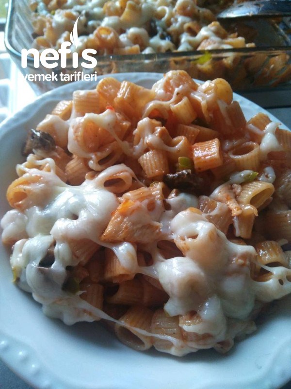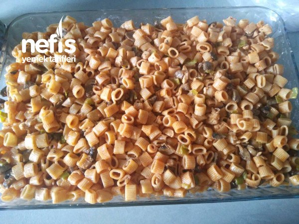 6. Makarna pişirdiğiniz gibi az salça ile pişirin karıştırıp ocaktan alın pişireceğiniz tepsiye makarnayı ve mantarlı sotenizi döküp karıştırın.
