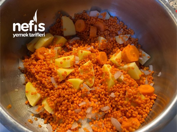 - Üzerine doğranmış patates ve havuç eklenir yıkanmış mercimek eklenir iki dakika kadar kavrulur.