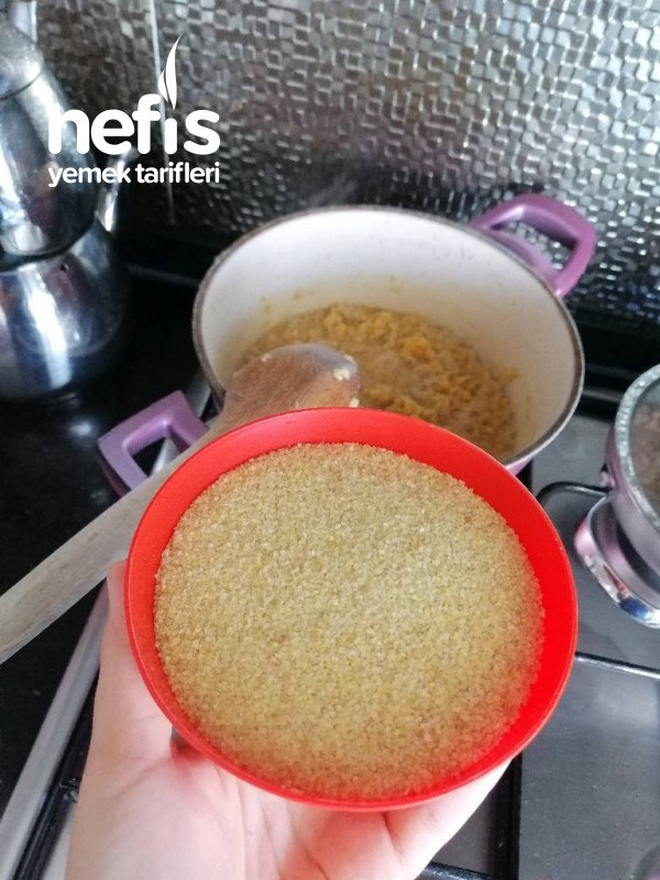 - 3 bardak suyu ile a edip ocakta kaynatıyoruz suyu çekilen mercimeğin üstüne bulgur ilave ediyoruz