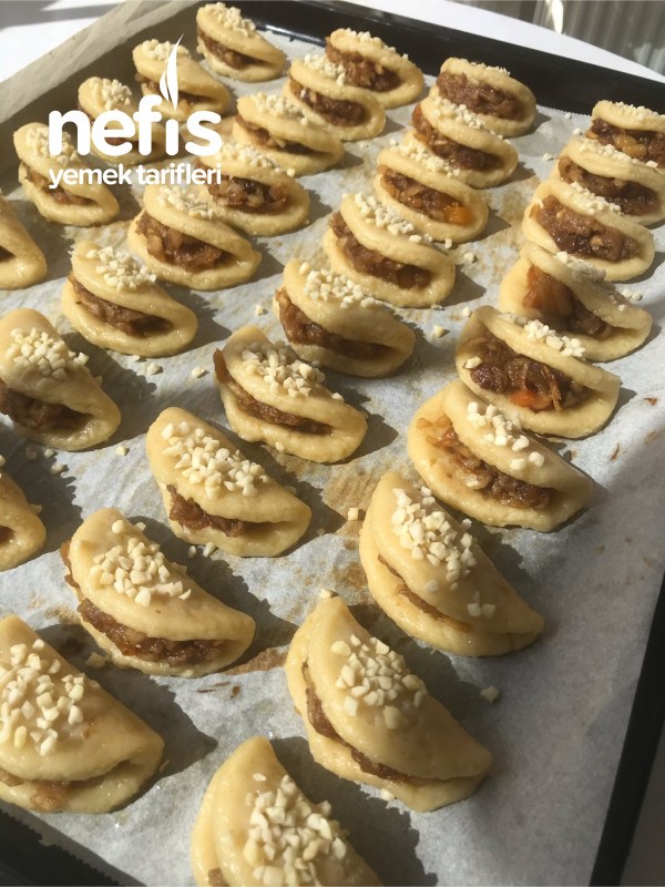 - Hamurdan bardakla kestikten sonra ortalarına meyveli harcımız dan koyalım ve ağzı açık kalacak şekilde yarım ay şeklinde fırın tepsisi ne dizelim.