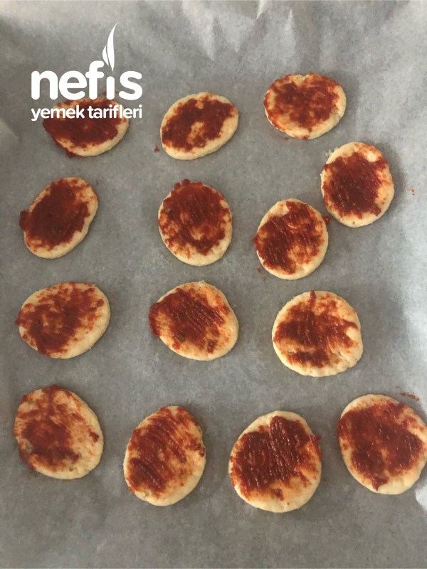 - Çay bardağının ağız kısmıyla daireler çıkarıp yağlı kağıt serili fırın tepsisine dizin ve salçalı sostan serip, üstüne diğer malzemeleri koyun.
