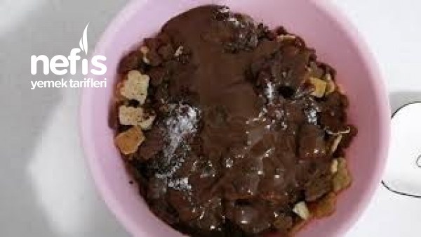 - Büyük bir kaseye bisküviler kırılır, üzerine kakao, ve vanilya eklenir.