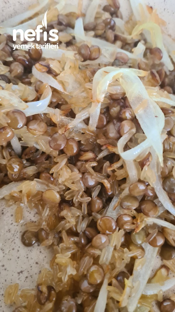 5. Pembeleşinceye kadar kavuralım. (benimkilerin pembeleşmediğine bakmayın kızıma onların makarna olduğunu söyledim de ondan????????) pirinci ekleyip şeffaflaşıncaya kadar güzelce kavuralım. Peşine mercimeği ekleyelim onu da güzelce harmanlayalım az bişey onu da tavada çevirelim ????.