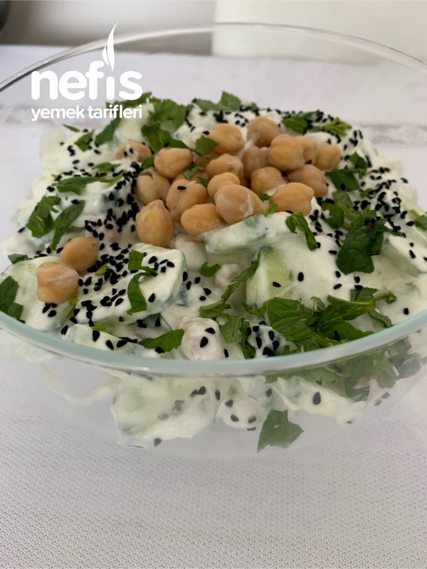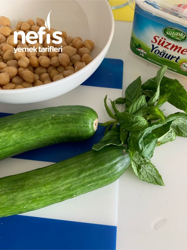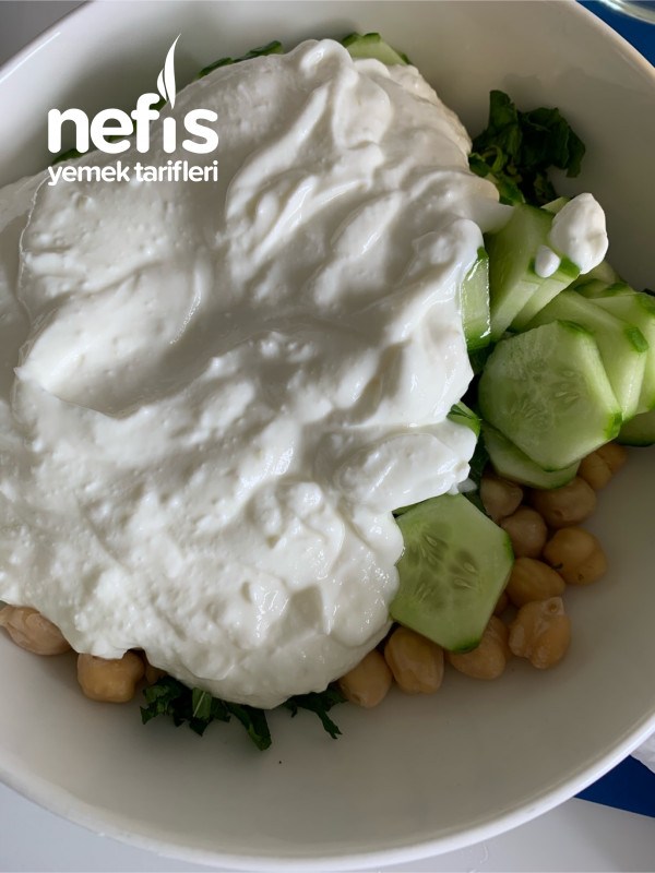 - Çırpılan yoğurda salatalık ve nohutu ekleyip karıştırıyoruz.