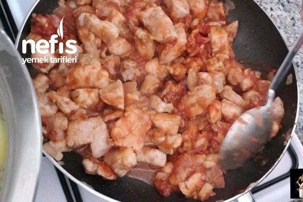 - ????Soğan, sarımsak ve kuru domatesi yağda biraz kavurup üzerine küçük küçük kestiğimiz tavukları ilave edip güzelce kavuruyoruz.