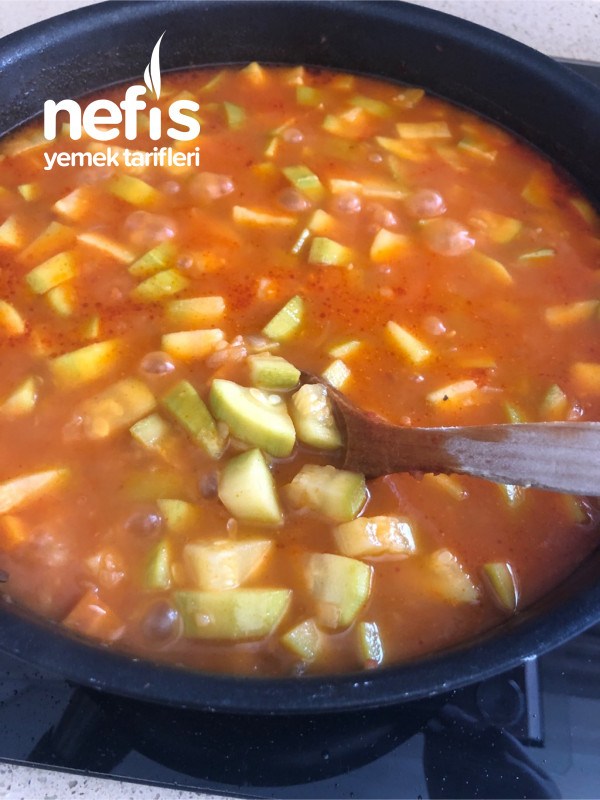 - Kabakları da çok büyük olmayacak şekilde doğruyoruz salça ve tuz ile birlikte ekleyip iyice kavurduktan sonra suyunu ekleyip orta ateşte pişmeye bırakıyoruz.