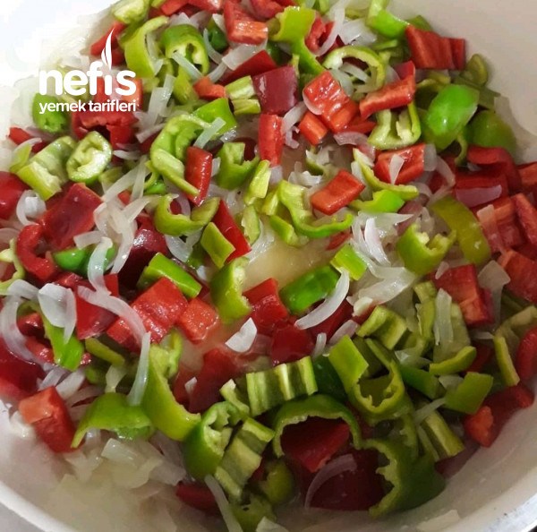 - Üzerine doğranmış kapya ve yeşil biberleri ekleyip biberlerde yumuşayana kadar kavurmaya devam ediyoruz.