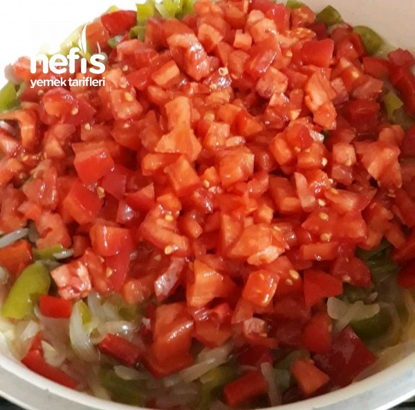 - Daha sonra salçayı ilave edip kokusu çıkana kadar kavurup kabukları soyulmuş minik küpler halinde doğranmış domatesleri ve pulbiber ekleyip domatesler suyunu çekene kadar pişiriyoruz.