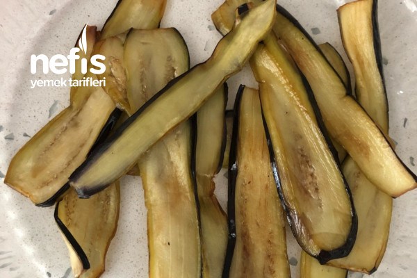 3. Patlıcanlar yıkanır alacalı soyulur. 1 cm kalınlığında uzunlamasına dilimlenir.