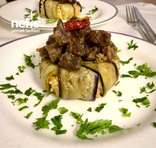 16. İçine pilav doldurulur. Kenarları katlanır ve servis tabağına ters çevrilir. Üzerine et sote ilave edilir. Servise hazır. Afiyet olsun ????????.