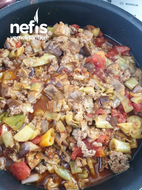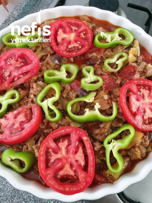 5. Daha sonra 2 domatesi küp küp doğrayın ve kıymaya ekleyin. Çok az kavurduktan sonra patlıcanların üstüne kıymalı harcı koyup sıcak suyu da ilave edin. 10 dk üstü kapalı ocakta pişirin.