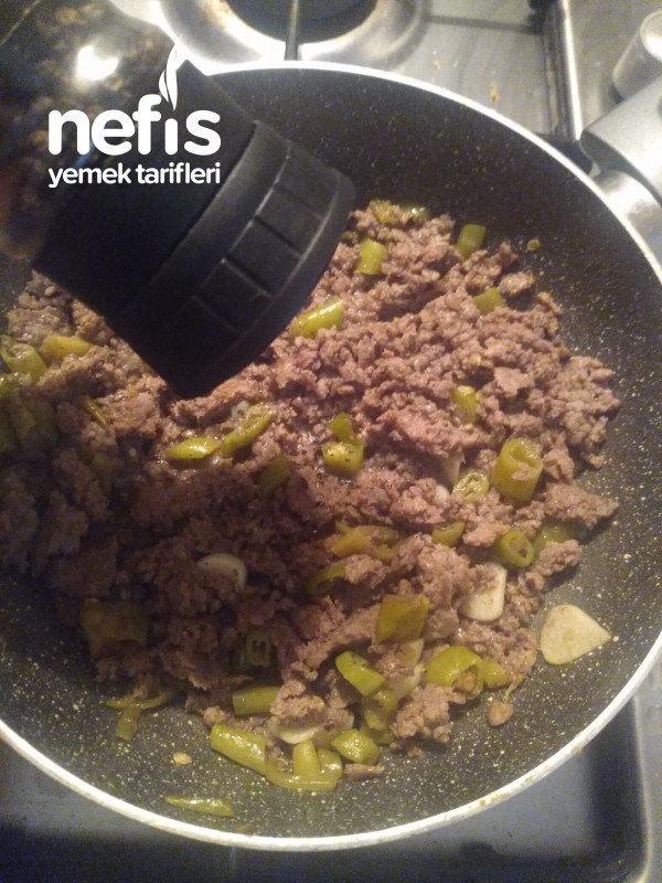 - Ayrı bir tavada kıyma kavrulur. Soğan ve biber üzerine eklenir. Kavrulunca baharatlar atılır. Domates katılır ocaktan alınır.