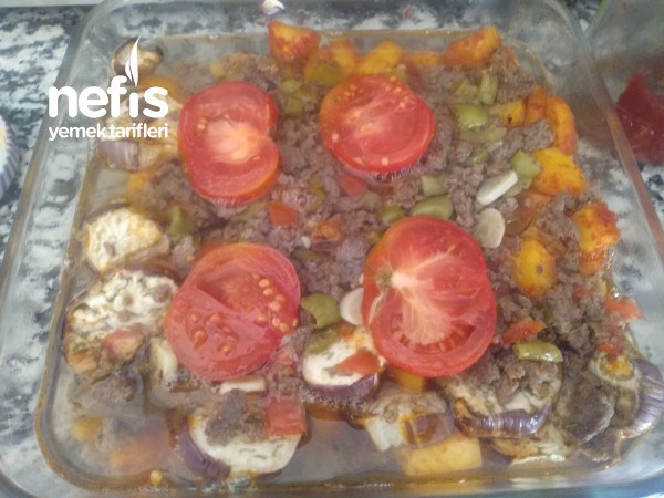 - Borcamın en altına patatesler, üzerine patlıcanlar ve en üstünde kıyma gelecek şekilde bastırılarak konulur.