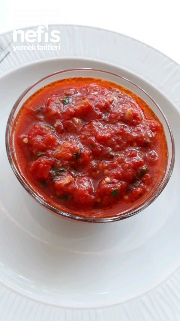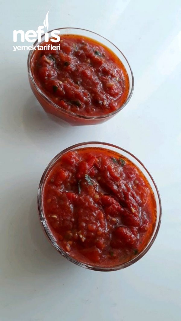 - Domatesler suyunu çeķmeye yakın, yağını, sirkesini, tuzunu, sarımsağını, şekerini, ince doğranmış acı biberimizi, pulbiberimizi katalım.
