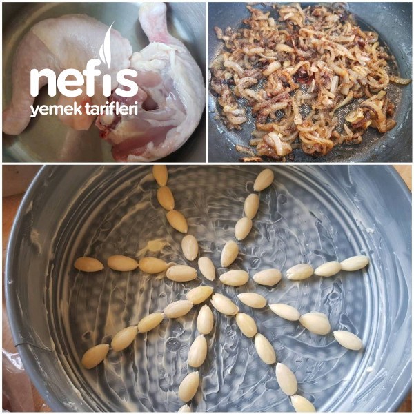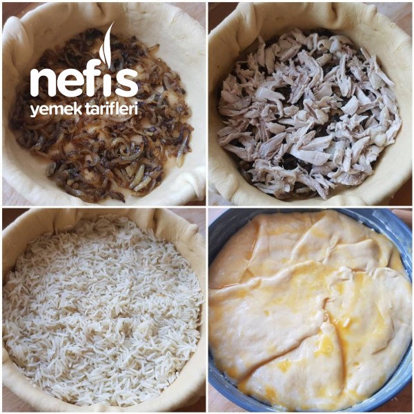 6.  Önce soğan, daha sonra didiklenmiş tavuk eti ve en son pirinç kek kalıbındakı hamurın üzerıne konup fazla olan hamur ile kapatılır ve üzerine yumurta sarısı sürülür.