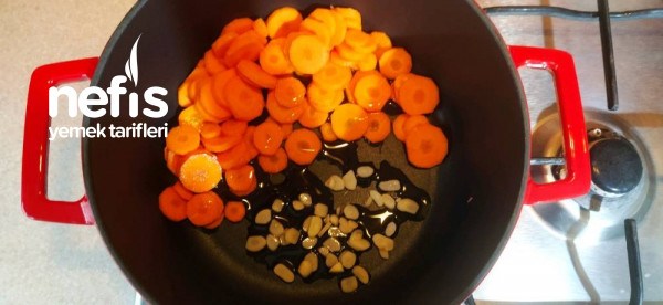 - Kabukları soyulmuş havuç ve sarımsaklar ince ince dilimlenerek tencereye alınır sıvı yağda havuçlar yumuşayana kadar kavrulur.
