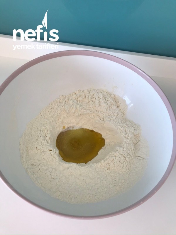- İlk önce hamurumuzu yapıyoruz; unu kaba alıp ortasını açıyoruz.