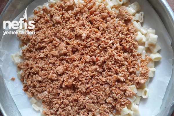Haşlanan makarnalarımızın yarısını fırın tepsimize koyup üzerine tavuk kıymalı harcımızı ekliyoruz. Tekrardan üzerine kalan makarnalarımızı ekleyip beşamel sosunu gezdiriyoruz. En üstüne de rendelenmiş kaşar peyniri ilave edip fırında 15 dk kadar pişiriyoruz. Afiyet olsun.