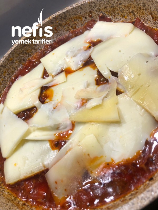 - Pişen domatesimizin üzerine yeteri kadar dilim veya rendelenmiş kaşar peynirini ilave edip tavanın kapağını bir kaç dakika kaşar peyniri eriyene kadar kapatıyoruz.