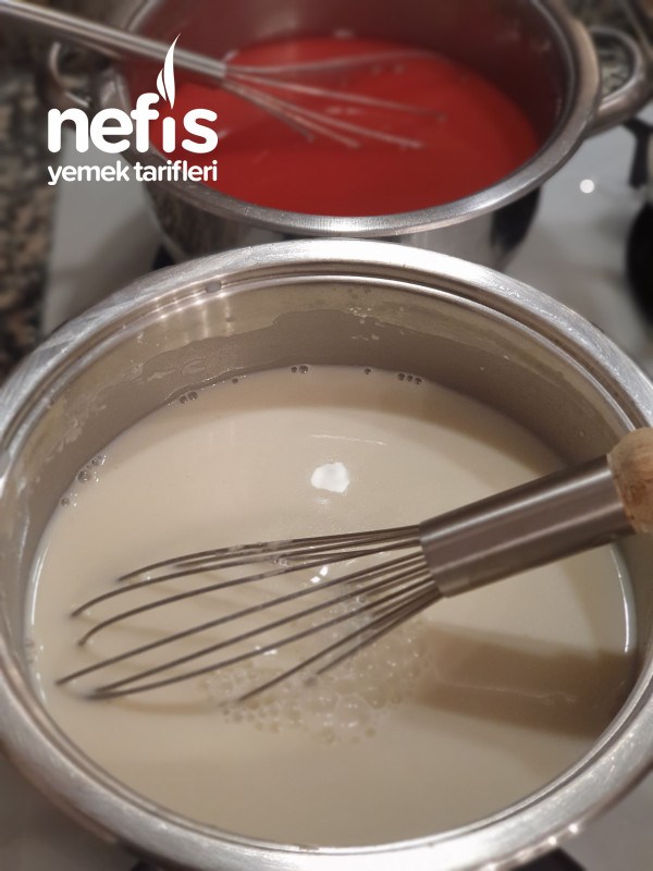 - Ayrı bir tencereye de üç su bardağı vişne suyu ile toz pudingi karıştırıp ikisini de ayrı ocaklara koyup altlarını yakıyoruz.