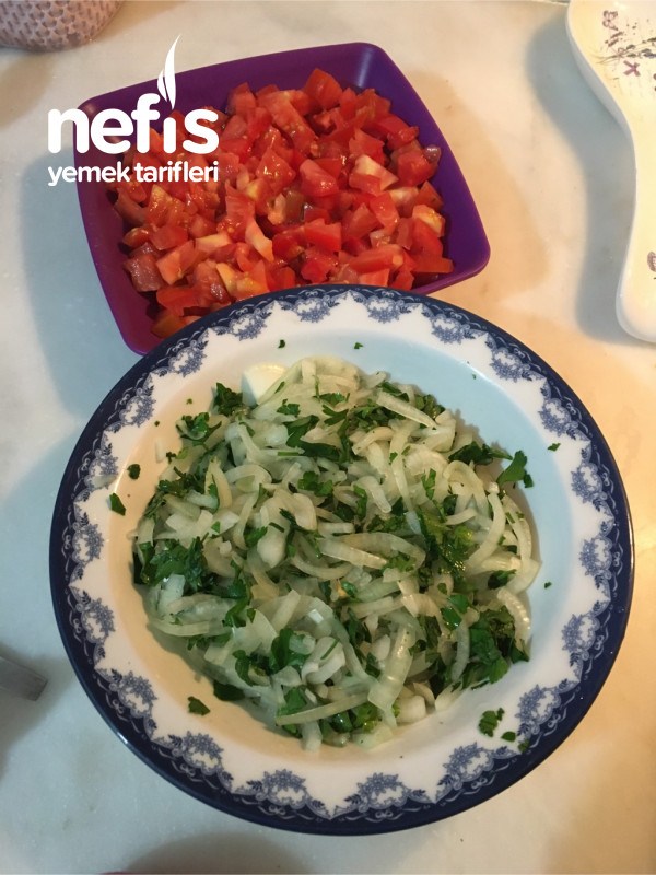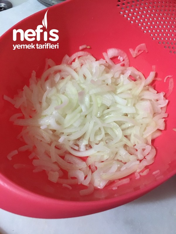 - Soğanları ince ince yarım ay şeklinde doğruyoruz 1 tatlı kaşığı tuz atıyoruz ve iyicene elimizle ovuyoruz. Biraz dinlendirdikten sonra suya yıkayıp süzüyoruz ve soğanımız hazır isteğe göre sumak atabilirsiniz.