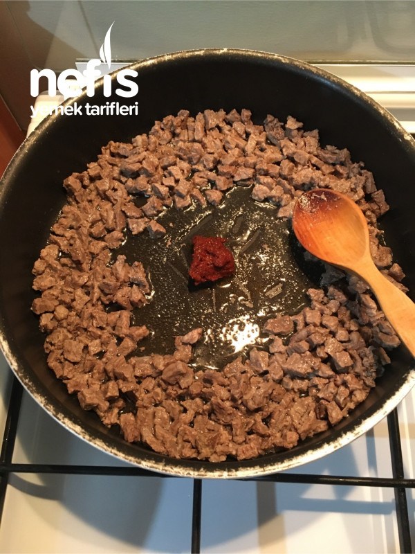 - Etlerin üstüne sıvı yağı döküyoruz ve orta ateşde pişirmeye başlıyoruz. Isınınca biber salçası ardından da kırmızı pulbiberi atıyoruz. Biraz çeviriyoruz ve 1 çay bardağı suyu döküyoruz. Su ısınınca etlerde iyicene yumuşayınca tuzunu atıyoruz ve biraz daha göz kararı sıvı yağ ekleyip altını kısıyoruz.