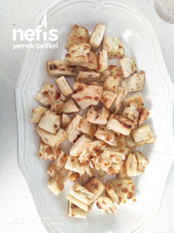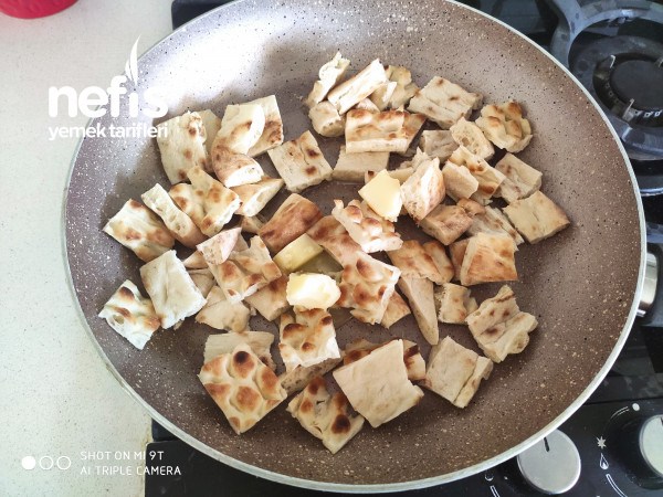 1. Ekmeklerimizi doğrayıp tereyağı ile kavuruyoruz.