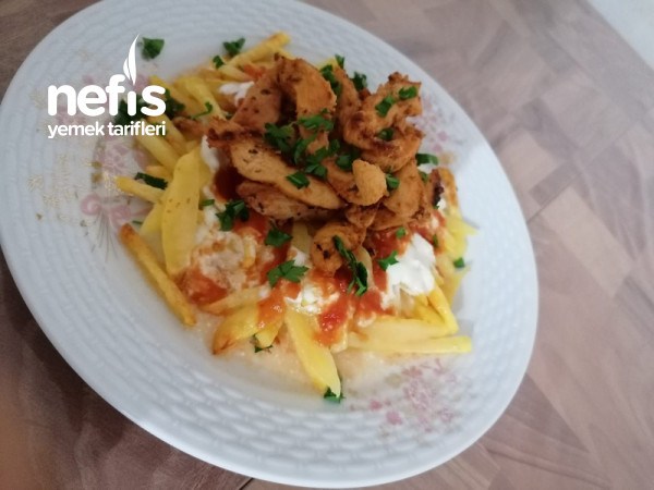 7. Üzerine sarımsaklı yoğurt gezdirelim onun üzerine domatesli sos gezdirip kızaran tavukları dizelim.