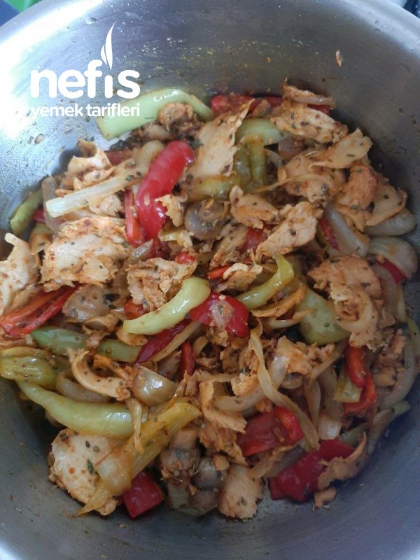 7. Tavuk dönerimizi ilave edip kavurmaya devam edilir.