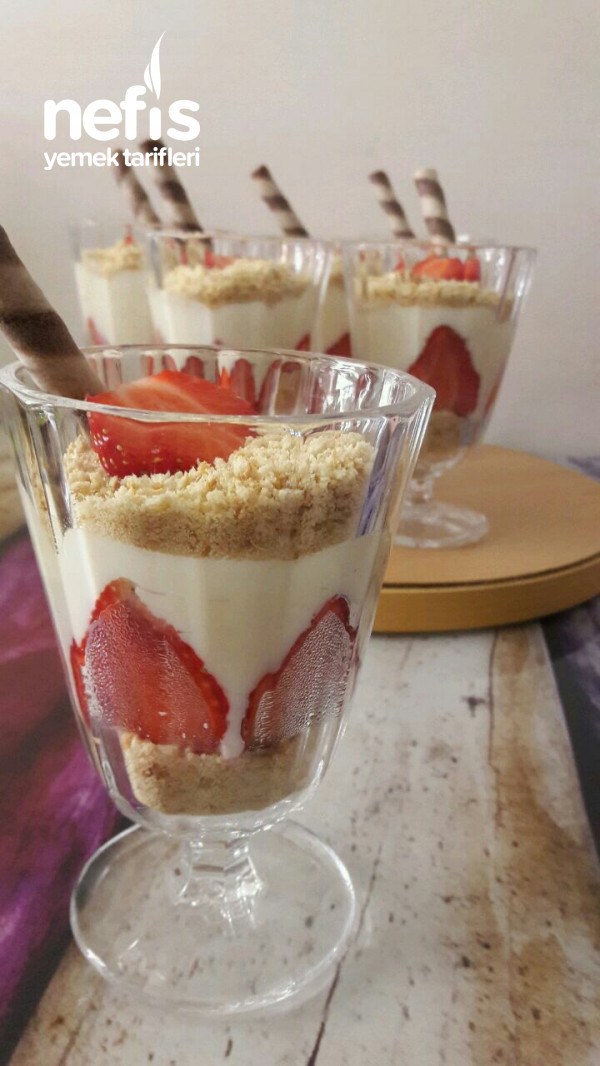 - Ardından üzerine bir kat muhallebi arasına çilek ve tekrar bisküvi eklenip.