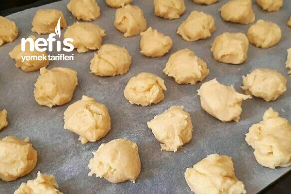 - Yağlı kağıt serdiğimiz fırın tepsisine hamurları kaşık yardımıyla ceviz büyüklüğünde bırakıyoruz.