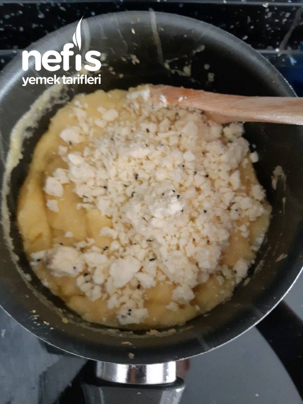 4. Yavaş yavaş koyulaşan hamurumuz iyice koyulaşınca içine peynirimizi döküyoruz.