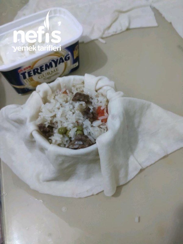 - Yufkanın uçlarına biraz yumurta sürün ve sıkıca pilavın üzerine kapatın.