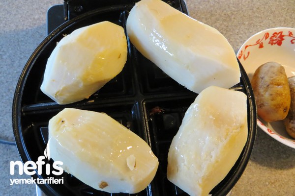 Patatesleri ister soyup kaynatın, ister kaynattıktan sonra soyun, veya bir gün önceden fırında yemek yapıyorsanız, bir kaç patatesi de fırına atın diğer yemekle birlikte pişsin. Waffle veya tost makinasını ısıtın, ve patateslerin üzerine biraz sıvı yağ, tuz, karabiber sürün ve makinaya yerleştirin, iyice kızardıktan sonra ek yemek olarak ana yemeğin yanında servis edin. Afiyet olsun.
