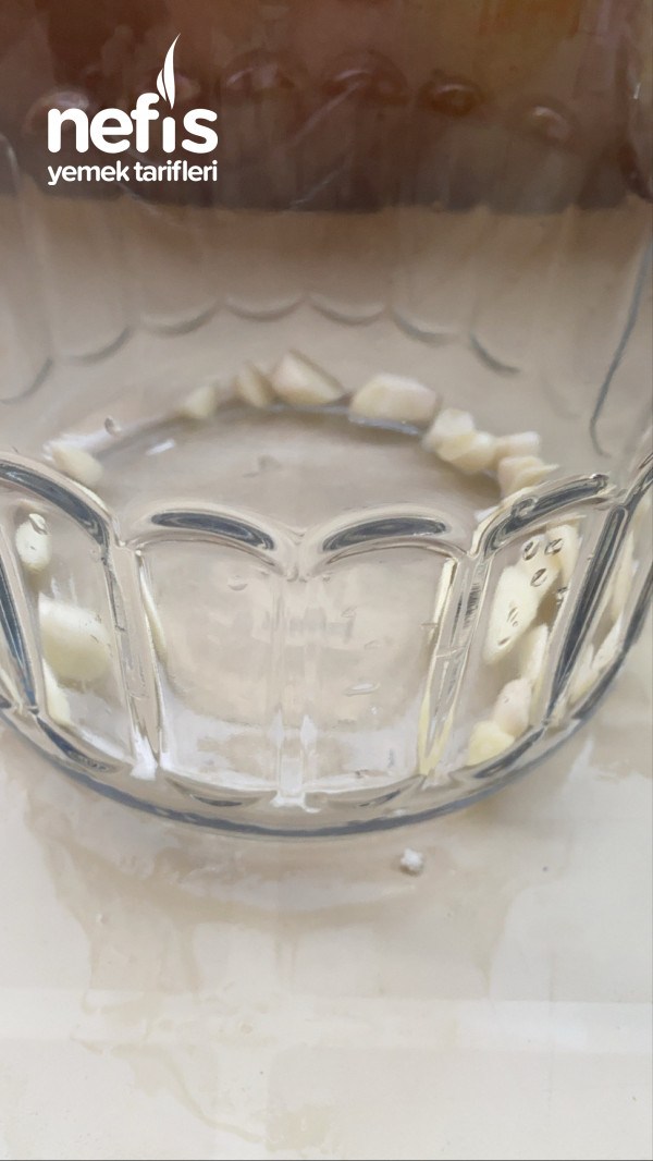- Koyacağım kavanozun en alt kısmına bir avuç kadar sarımsağımı koydum.