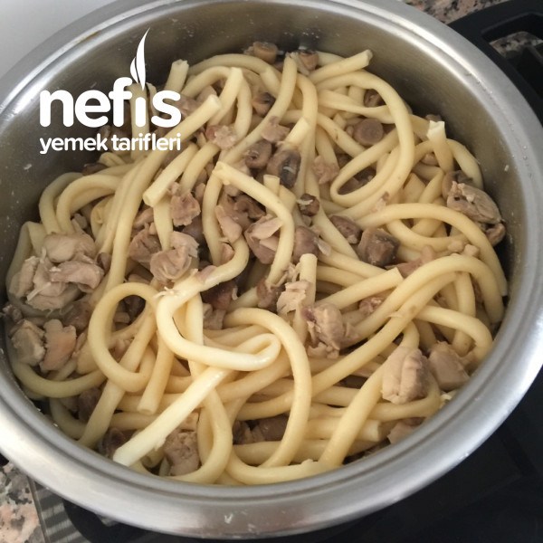 - Makarnayı kaynar suda az tuz ekleyerek haşlayın ve süzdükten sonra tavuklu mantarlı karışımı ilave edin.