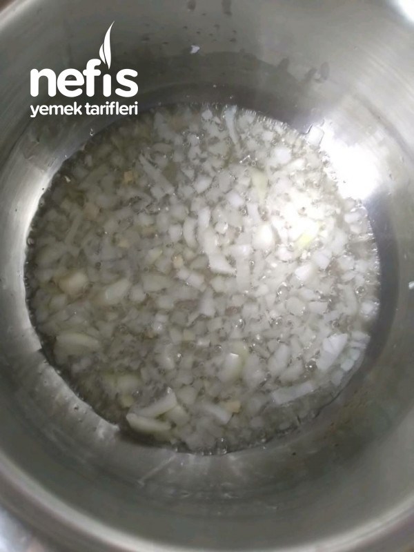 - Siyah suyu çıksın diye 19 dakika daha sonra süzüyoruz ve ince kıyılmış soğanlarımızı yağda kavuruyoruz .
