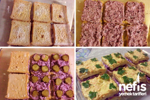Etimeklerin 7 tanesini ayran ile ıslatıp borcama aralıklı diziyoruz. Hepsinin üstüne kırmızı pancarlı karışımı bölüştürüyoruz ve kornişon turşuyu dilim yapıp etimeğin köşelerine gelecek şekilde pancarın üstüne yerleştiriyoruz. Kalan 7 etimeği de ayranla ıslatıp 2.katı diziyoruz. En üste havuçlu karışımı bölüştürüp maydanozla süslüyoruz. Etimekleri 4’e bölüp parçalara kürdan batırıp servis edebiliriz fakat etimek yumuşadığı için kürdan işlevini pek yerine getiremiyor. İster dilimleyip kürdan batırmadan lokmalık servisler yapabilirsiniz isterseniz de bütün olarak servis yapabilirsiniz. Afiyet olsun.