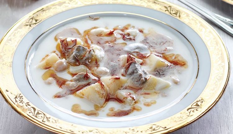 Parça et, nohut ve bir miktar suyu tenceye alıp üzerini geçecek kadar su ekleyin. Pişme sırasında üstünde biriken köpüğü alın. Nohut ve et yumuşayana kadar pişirin. Patatesleri iri parçalar şeklinde doğrayın. Kızgın yağda kızartın. Patatesleri pişen nohutlu ete ekleyin. Süzme yoğurt, yumurta, un ve zeytinyağını bir kasede iyice çırpın. Pişen yemeğin suyundan birkaç kaşık ekleyip karışımı ılındırın. Yemeğe azar azar ve karıştırarak ekleyin. Un kokusu gidene kadar pişirin. Tuzla tatlandırın. Tereyağını tavada eritip haspiri ekleyin. Yemeğin üzerine gezdirin. Sıcak servis yapın.