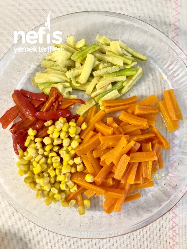 - Mısır bir süzgeçe alınıp süzülür. Sebzeler soğumaya bırakılır.
