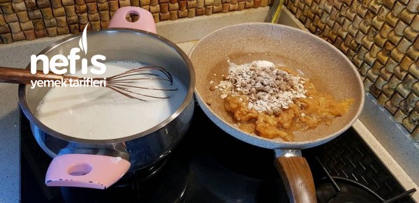 4. Eş zamanlı olarak başka bir tencerede süt, nişasta ve şekeri ocağa alın ve çırpma teli ile hızlıca çırpın, orta ateşte pişirin.